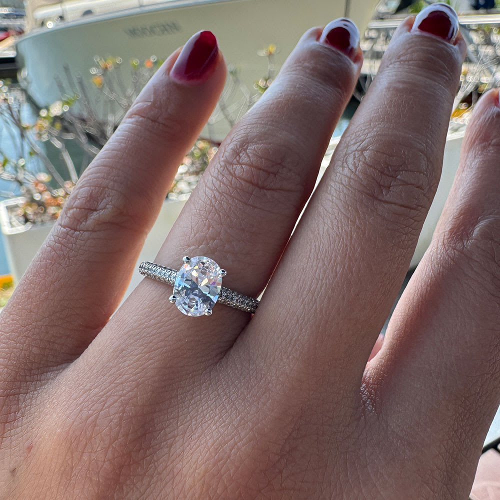 An Oval cut diamond engagement ring is one of the most popular cuts for engagement rings, and for good reason! It sparkles like none other. The classic solitaire setting highlights the diamond and gives you options to play with different styles of wedding bands. This gorgeous diamond engagement ring is set with a 1.20ct Certified oval diamond in a four claw setting on a beautifully crafted on a diamond band. This ring style can be customized to your choice of diamonds of any size and quality to meet your desired budget. All rings are available in Platinum, 18K White, Yellow, and Rose Gold. Please contact Temple and Grace team to learn more about this ring or to request pricing on something specific you may have in mind.